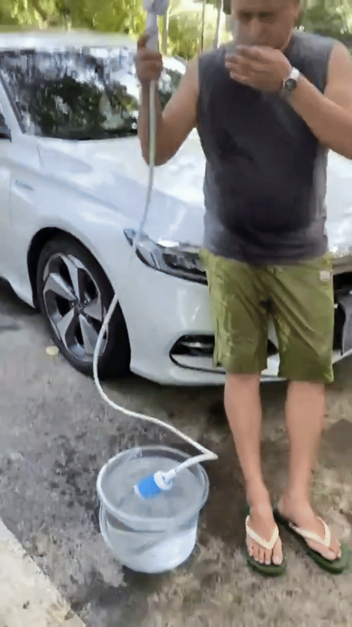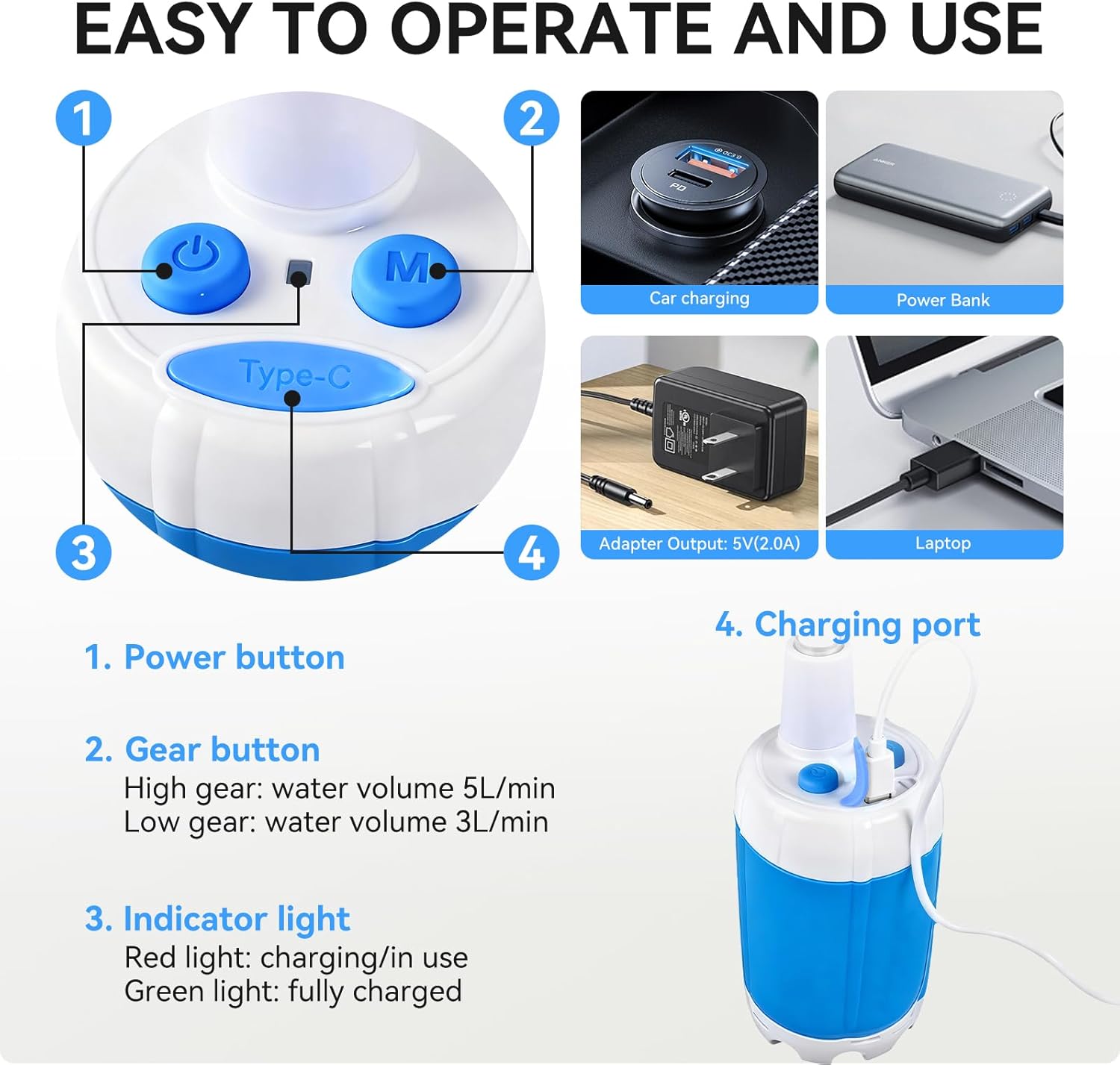 AquaFlow draws water from any container (bucket, bottle, or stream) and delivers a steady shower flow with the press of a button.